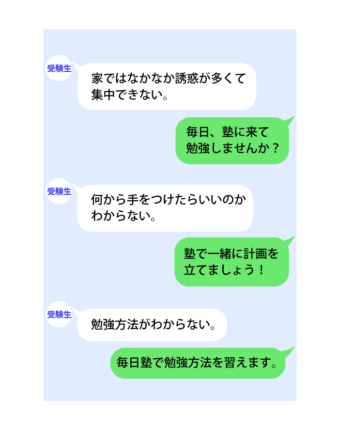 こういったドラマが毎年起こっています。但し、進路相談、学習相談に耳を傾け従った生徒の多くは現役合格をしましたが過去にはそうでなかつた生徒もいたことも事実です。